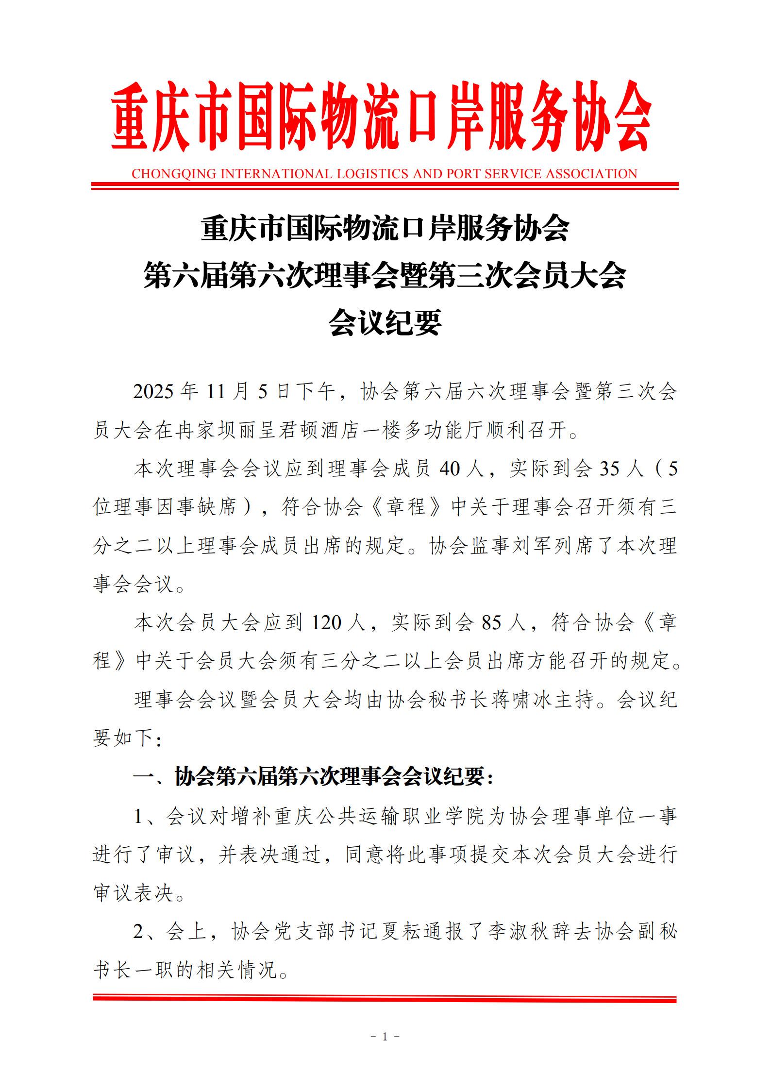 重庆市国际物流口岸服务协会第六届第六次理事会暨第三次会员大会会议纪要