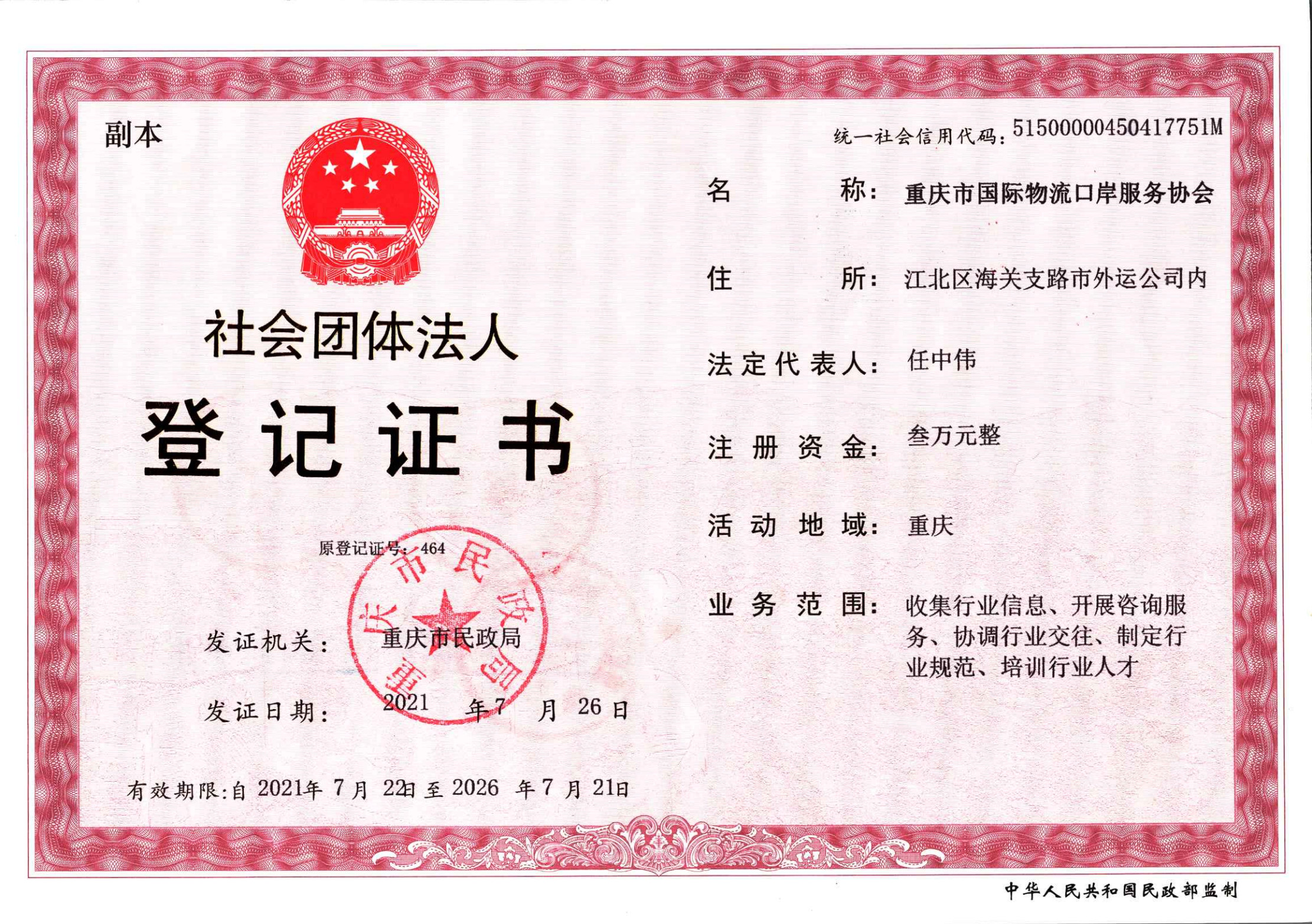 重庆市国际物流口岸服务协会社会团体法人登记证书