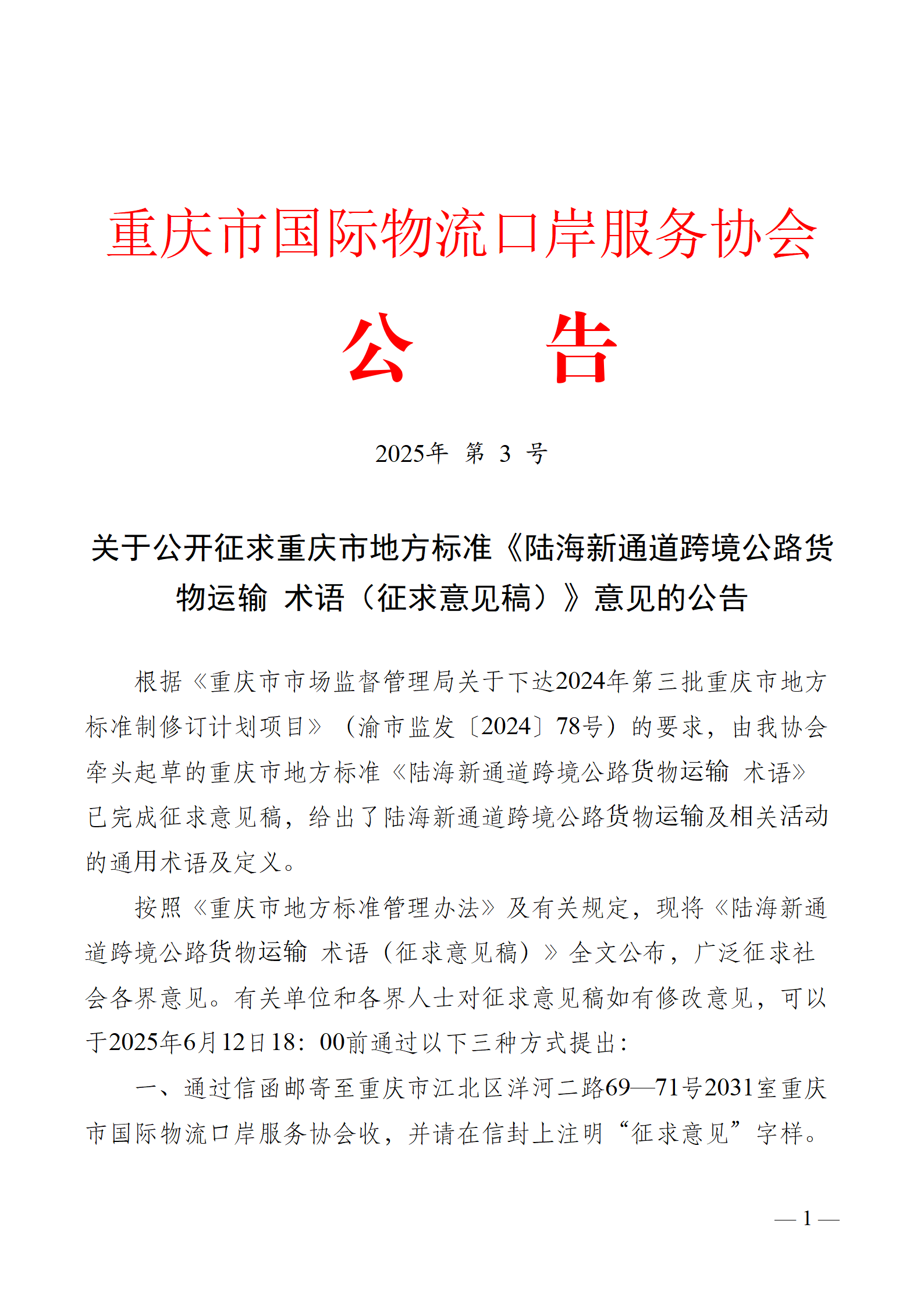 关于公开征求重庆市地方标准《陆海新通道跨境公路贸易 术语(征求意见稿)》意见的公告